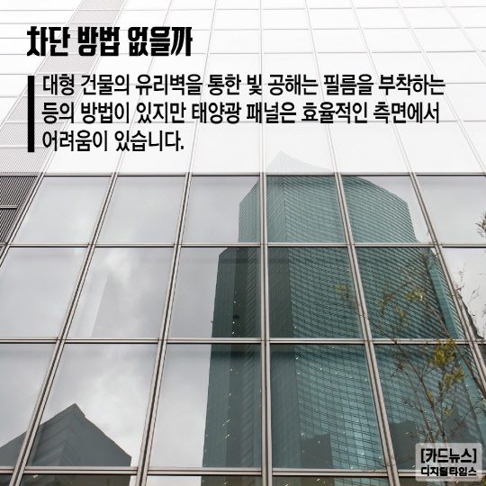 대형 건물의 유리벽을 통한 빛 공해는 필름을 부착하는 등의 방법이 있지만 태양광 패널은 효율적인 측면에서 어려움이 있습니다.