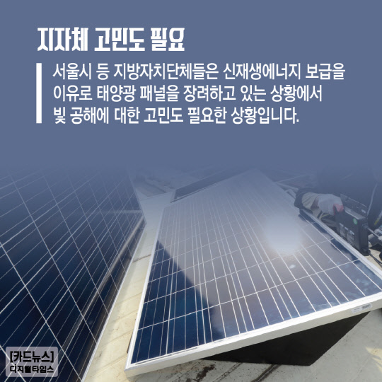 서울시 등 지방자치단체들은 신재생에너지 보급을 이유로 태양광 패널을 장려하고 있는 상황에서 빛 공해에 대한 고민도 필요한 상황입니다.