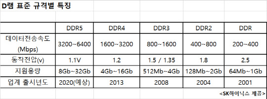 SK하이닉스가 이번에 개발한 DDR5 D램은 기존의 DDR4 D램보다 동작 전압이 낮아져 전력소비량을 30% 줄일 수 있는 동시에 전송속도는 5200Mbps(초당 Mb 전송속도)로 기존 제품(3200Mbps)의 1.6배 수준이다. 이는 고화질(풀-HD)급 영화 3.7GB 11편에 해당하는 41.6GB의 데이터를 단 1초에 처리할 수 있는 속도다.