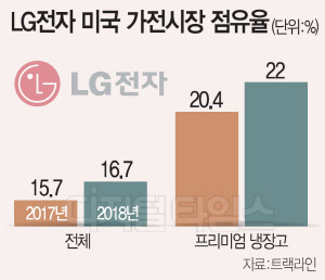 LG전자는 프리미엄 제품으로 미국 시장에서 영향력을 확대하고 있다. 일례로 미국 시장조사업체 트랙라인에 따르면 LG전자의 프리미엄 냉장고(프렌치 도어) 부문 미국 시장 점유율은 지난해 20.4%에서 올 상반기 22%로 1.6%포인트 증가했다.