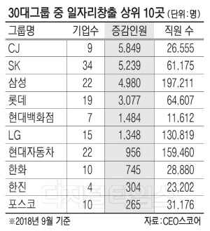 15일 기업경영성과 평가사이트 CEO스코어가 국내 30대 그룹 계열사 267개 업체를 상대로 9월 말 기준 고용인원을 조사한 결과, CJ그룹이 고용을 가장 많이 늘렸다.