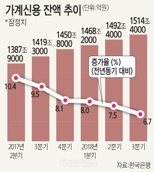 한국은행이 21일 낸 '2018년 3분기 중 가계신용'에 따르면 3분기 중 가계신용 잔액은 1514조4000억원으로 처음으로 1500조원을 넘었다.