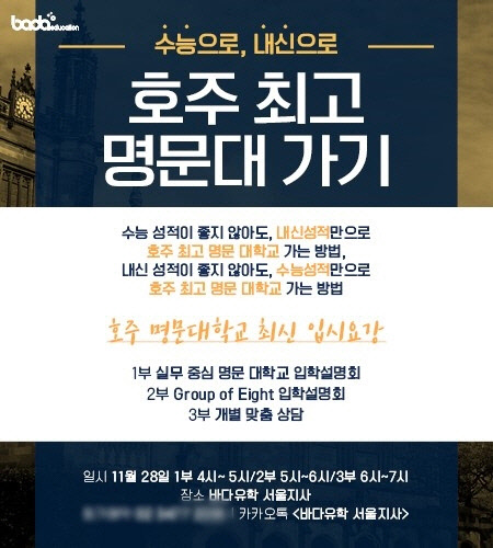 이번 입학설명회는 호주 최고 명문대학교인 시드니대학교, 멜번대학교, 호주국립대학교, UNSW대학교, 모나쉬대학교, 퀸즐랜드대학교, 아들레이드대학교, 서호주대학교 등 G8대학교를 포함하여 상경계열 명문대학교인 맥콰리대학교, 디자인, IT계열 명문대학교인 UTS대학교, 경영 명문 학교인 카플란 경영대의 입학설명회가 진행될 예정이다.