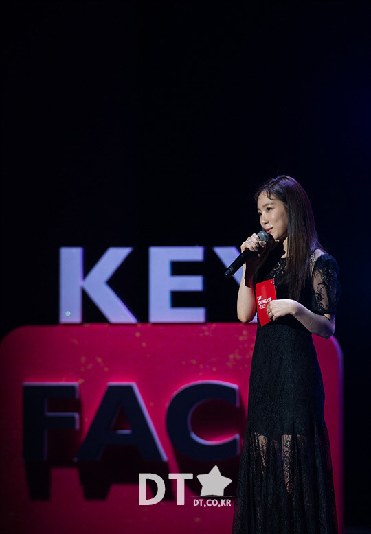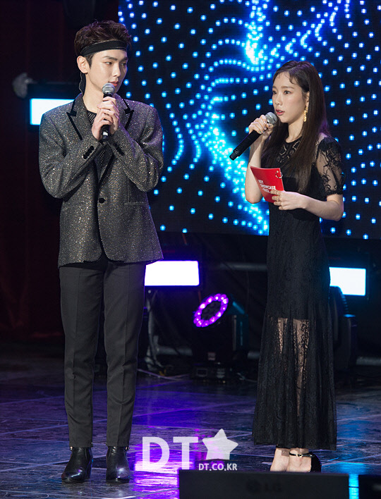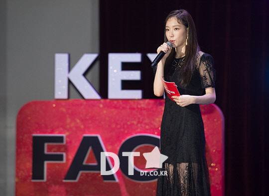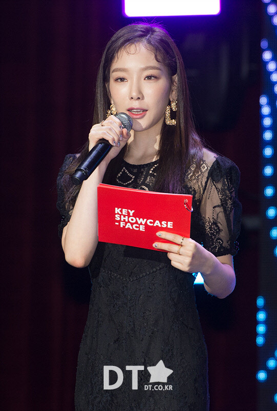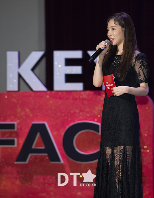 그룹 소녀시대의 태연이 26일 서울 광진구 건국대학교 새천년관에서 열린 그룹 샤이니의 키(Key, 김기범) 첫 정규 앨범 '페이스(FACE)' 쇼케이스에서 사회를 보고 있다.