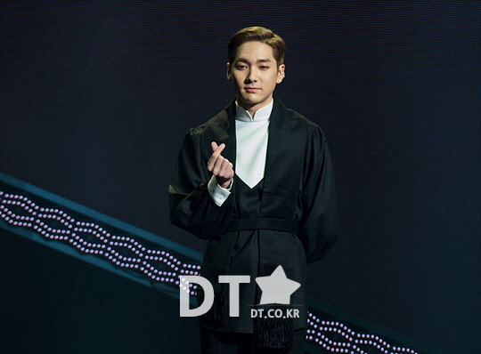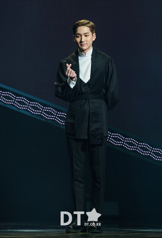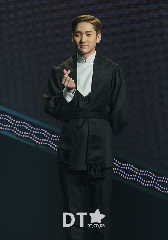 그룹 뉴이스트 W의 아론(Aron)이 26일 서울 용산구 블루스퀘어에서 열린 신규 앨범 '웨이크, 앤(WAKE, N)' 발매 기념 쇼케이스에서 포즈를 취하고 있다.