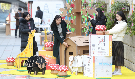 26일 서울 청계광장에서 열린 '우체국과 함께 하는 재생지 예술전시회'에서 행사 관계자들이 재생지 모형 작품을 살펴보고 있다. 우정사업본부는 매년 종이사용량이 늘고 있고 있지만 폐지 사용량은 줄어드는 상황에서 재생지에 대한 긍정적 인식 확산 및 사용활성화를 위해 서울시설공단, 사회적기업 위누와 함께 이번 행사를 기획했다.