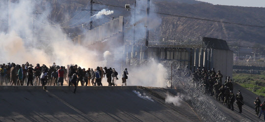 25일(현지시간) 미국 캘리포니아주 샌디에이고와 접경을 이루는 멕시코 티후아나에서 중미 출신 이민자(캐러밴·Caravan)들이 미국 국경순찰대 측이 발사한 최루가스를 피해 달아나고 있다.