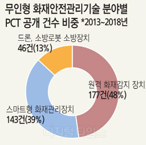 이 가운데 무인형 화재안전관리기술의 PCT(특허협력조약) 국제특허출원 분야를 보면 원격 화재감지장치가 177건(48%)으로 가장 많았다. 그 다음으로 스마트형 소방장치(143건, 39%), 로봇 드론을 이용한 소방장치(46건, 13%) 등의 순이었다.
