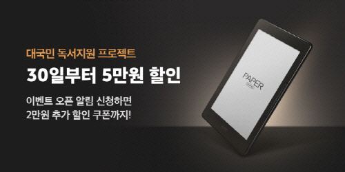 11월 30일부터 진행되는 이번 프로모션을 통해 정가 24만9천원의 페이퍼 프로를 5만원 할인된 가격에 구매할 수 있다. 뿐만 아니라 11월 29일까지 프로모션 사전 알림을 신청하면 2만원 할인 쿠폰을 받을 수 있어, 최저 17만9천원에 국내 유일의 7.8인치 전자책 단말기를 구매할 수 있다.