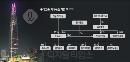 지난해 1월에는 롯데제과와 롯데칠성, 롯데쇼핑, 롯데푸드 등 4개사의 분할 및 분할합병을 통해 '롯데지주'를 출범, 지주회사 체제로의 본격 전환을 알렸다. 올 4월에는 롯데지알에스, 한국후지필름 등 6개사의 투자사업부문을 지주에 통합하면서 순환출자고리를 완전히 해소했다.