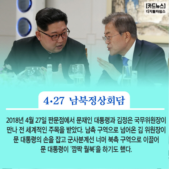 2018년 4월 27일 판문점에서 문재인 대통령과 김정은 국무위원장이 만나 전 세계적인 주목을 받았다. 남측 구역으로 넘어온 김 위원장이 문 대통령의 손을 잡고 군사분계선 너머 북측 구역으로 이끌어 문 대통령이 '깜짝 월북'을 하기도 했다.