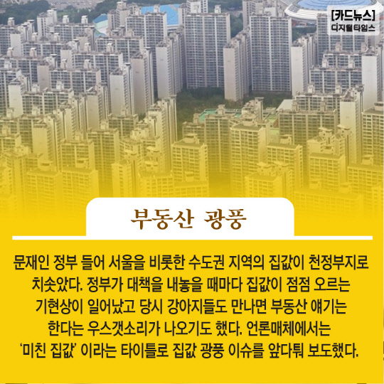 문재인 정부 들어 서울을 비롯한 수도권 지역의 집값이 천정부지로 치솟았다. 정부가 대책을 내놓을 때마다 집값 점점 오르는 기현상이 일어났고 당시 강아지들도 만나면 부동산 얘기는 한다는 우스갯소리가 나오기도 했다. 언론매체에서는 '미친 집값'이라는 타이틀로 집값 광풍 이슈를 앞다퉈 보도했다.