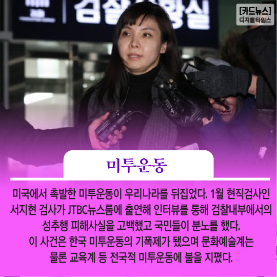 미국에서 촉발한 미투운동이 우리나라를 뒤집었다. 1월 현직검사인 서지현 검사가 JTBC뉴스룸에 출연해 인터뷰를 통해 검찰내부에서의 성추행 피해사실을 고백했고 국민들이 분노를 했다. 이 사건은 한국 미투운동의 기폭제가 됐으며 문화예술계는 물론 교육계 등 전국적 미투운동에 불을 지폈다.