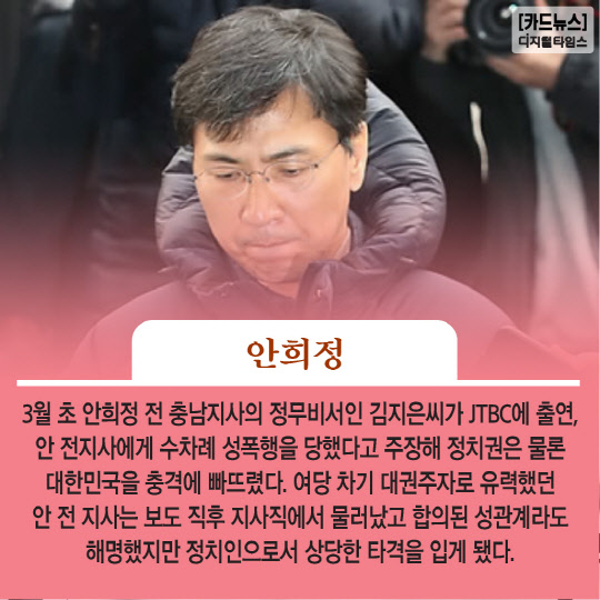 3월 초 안희정 전 충남지사의 정무비서인 김지은씨가 JTBC에 출연, 안 전지사에게 수차례 성폭행을 당했다고 주장해 정치권은 물론 대한민국을 충격에 빠뜨렸다. 여당 차기 대권주자로 유력했던 안 전 지사는 보도 직후 지사직에서 물러났고 합의된 성관계라도 해명했지만 정치인으로서 상당한 타격을 입게 됐다.