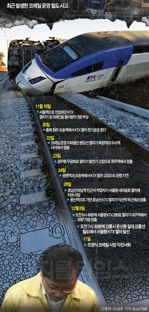 [디지털타임스 박정일 기자] 강릉선 KTX 탈선으로 정점을 찍은 잇단 열차 사고와 고장으로 결국 오영식 코레일 사장이 중도 하차했다. 지난달 19일 서울역에서 KTX 열차와 작업 중인 굴착기가 충돌사고를 낸 데 이어 3주간 무려 10건의 사고와 고장이 이어졌고, 결정적으로 강릉선 KTX 탈선 사고와, 오 사장의 대응 미숙이 국민 신뢰를 땅으로 떨어뜨린 데 따른 결과다. 전문가들은 '캠코더' 인사에 따른 전문성 부재가 잇단 열차 사고로 국민 불안을 가중시킨 끝에 결국 낙하산 사장 퇴진으로 이어졌다고 지적했다.