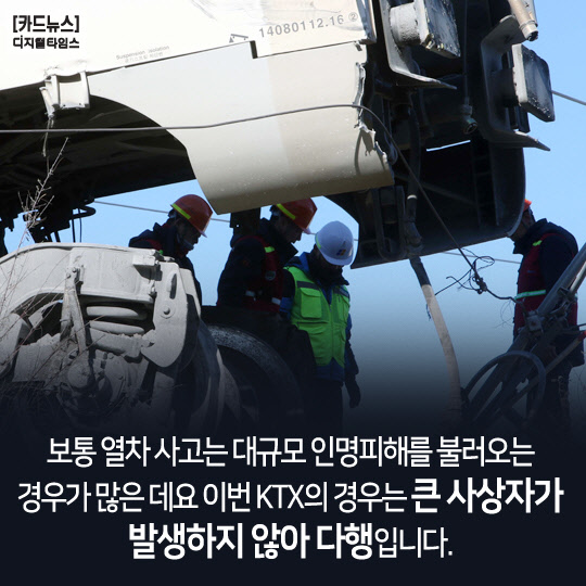 보통 열차 사고는 대규모 인명피해를 불러오는 경우가 많은 데요 이번 KTX의 경우는 큰 사상자가 발생하지 않아 다행입니다.