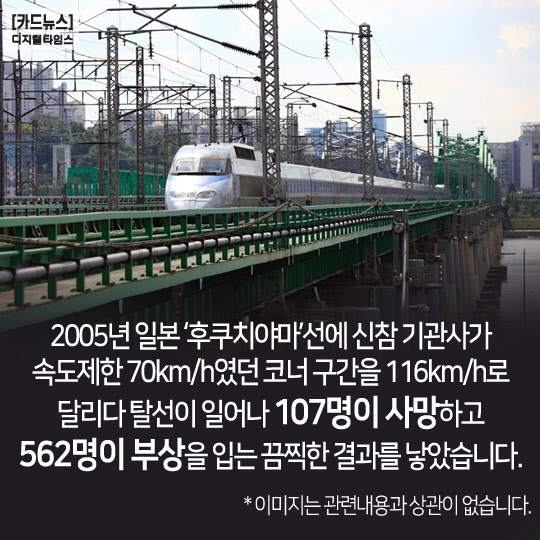 2005년 일본 '후쿠치야마'선에 신참 기관사가 속도제한 70km/h였던 코너 구간을 116km/h로 달리다 탈선이 일어나 107명이 사망하고 562명이 부상을 입는 끔찍한 결과를 낳았습니다.