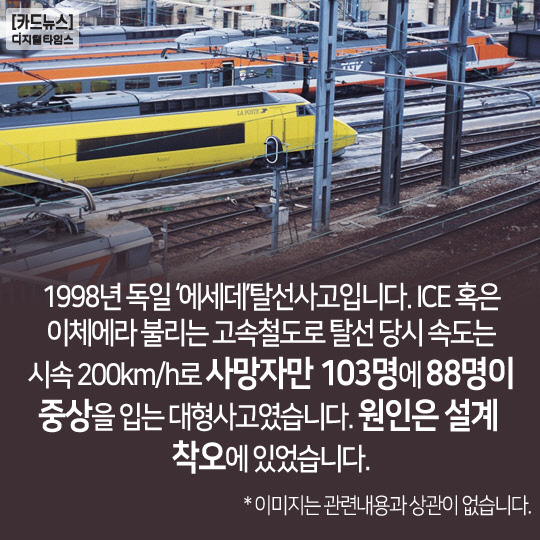 1998년 독일 '에세데'탈선사고입니다. ICE 혹은 이체에라 불리는 고속철도로 탈선 당시 속도는 시속 200km/h로 사망자만 103명에 88명이 중상을 입는 대형사고였습니다. 원인은 설계 착오에 있었습니다.