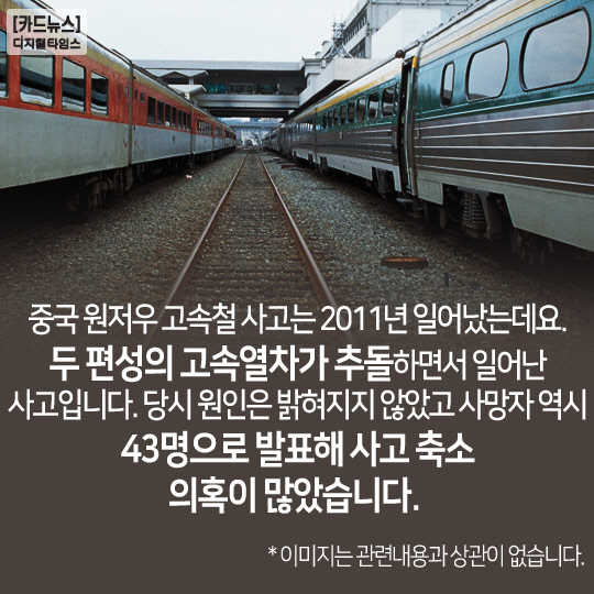 중국 원저우 고속철 사고는 2011년 일어났는데요. 두 편성의 고속열차가 추돌하면서 일어난 사고입니다.