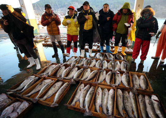 찬바람이 불면서 겨울 생선의 대명사인 대구 조업이 경남 남해안에서 본격적으로 시작됐다. 12일 오전 경남 거제시 장목면 외포리 거제수협 외포공판장에서 갓 잡아 올린 대구 경매가 한창이다.