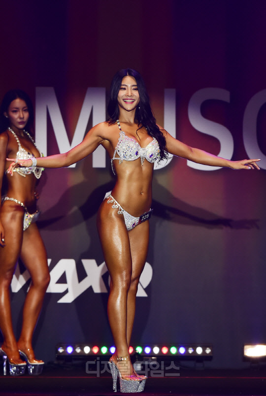 피트니스 모델 박현진이 서울 강서구 KBS아레나에서 진행된 '2018 핀인터내셔날 맥스큐 머슬마니아 피트니스 코리아 챔피언십'에서 미즈비키니 부문에 출전, 포즈를 취하고 있다.