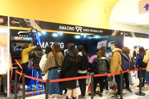 특히 아케이드 최초 케이팝(K-pop) 수록곡 '아이콘-죽겠다'와 함께 '워너원-부메랑' '아이즈원-라비앙로즈'를 처음으로 공개한 가상현실(VR) 아케이드 리듬 게임인 ㈜스코넥엔터테인먼트의 '비트세이버 아케이드' 체험존은 30분을 넘어가는 긴 대기시간에도 불구하고 VR K-pop 게임을 체험해 보려는 관람객의 발길이 이어졌다.