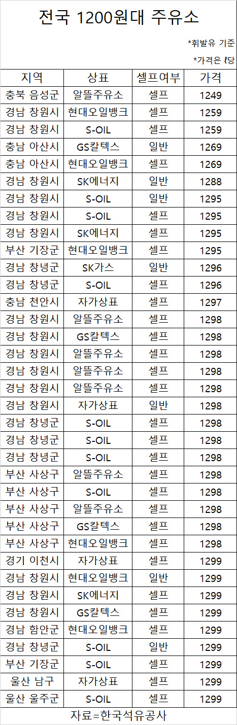 상표별로 에쓰오일(S-Oil)이 11개로 가장 많았고, 알뜰주유소(7개), 현대오일뱅크(6개), GS칼텍스와 자가상표(4개), SK에너지(3개) 등의 순으로 나타났다. 1200원대 주유소 중 셀프주유소가 29개로 압도적으로 많았다.