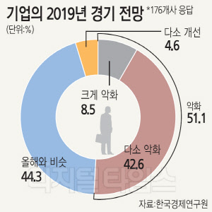 전국경제인연합회 산하 한국경제연구원은 여론조사업체 모노리서치에 의뢰해 매출 1000대 기업을 대상으로 조사한 결과 응답 기업 176개사 가운데 51.1%가 내년 경기가 악화할 것이라고 응답했다고 19일 밝혔다. 올해와 비슷할 것이라고 응답한 기업은 44.3%였으며 올해보다 개선될 것이라고 전망한 기업은 4.6%에 그쳤다.