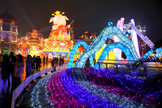 중국 동부의 장쑤성 남부 창저우에서 22일 관광객들이 등축제를 구경하고 있다. 이날 베이징에서 열린 경제 포럼에서는 한원슈(韓文秀) 중앙재경위원회 판공실 부주임이 "중국의 올해 국내총생산(GDP)은 90조 위안(13조7000억 달러), 1인당 GDP는 9900달러에 달할 것으로 예상한다"고 밝혔다.