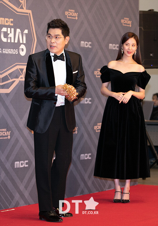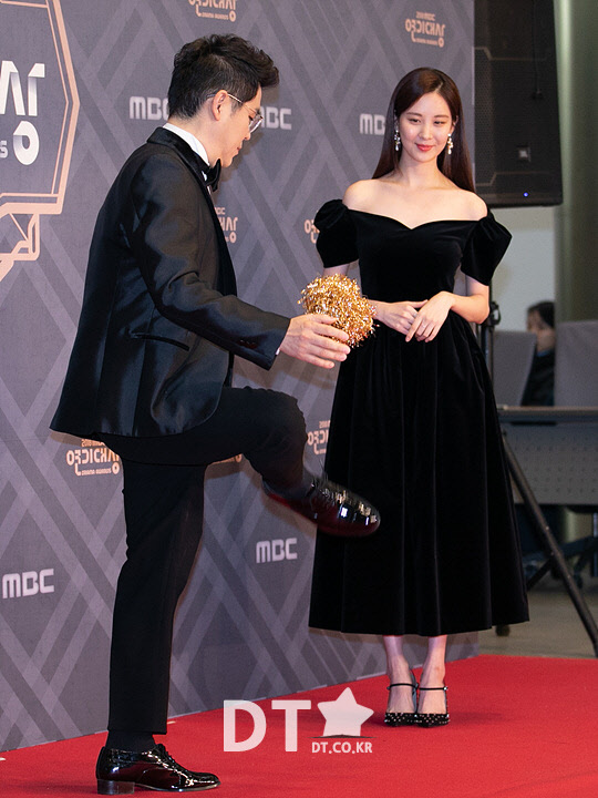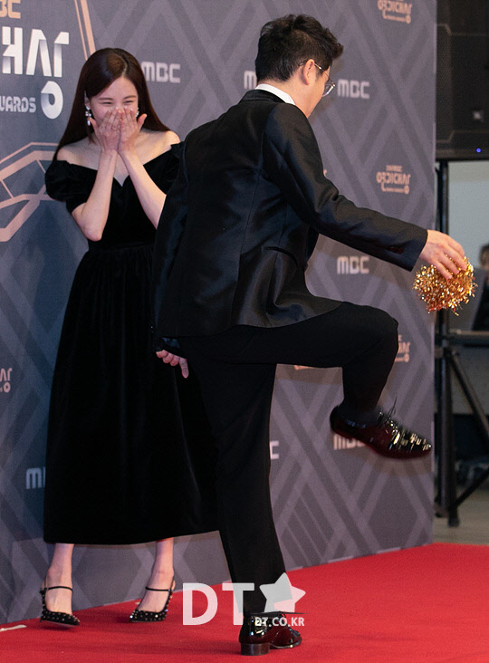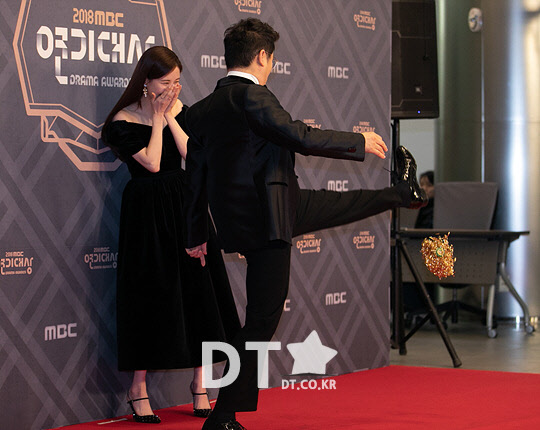 방송인 김용만이 30일 서울 마포구 상암동 MBC에서 열린 '2018 MBC 연기대상' 레드카펫 행사에 참석해 사회자의 요구에 제기를 차고 있다. 그 모습을 본 배우 서현이 놀란 모습을 하고 있다.