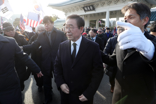 박원순 서울시장(가운데)이 새해 첫날인 1일 오전 동작구 국립서울현충원을 참배 후 보수단체 관계자들로부터 거친 항의를 받으며 현충원을 떠나고 있다.