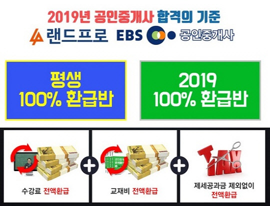 먼저 '2019 100%환급반'은 제30회 공인중개사 시험준비를 위한 패키지로 올해 시험일정까지 독학에 도움을 주는 EBS 교재 저자진의 공인중개사 인강을 제공받으며 시험공부를 할 수 있다. 랜드프로 공인중개사 인강은 8단계 커리큘럼에 의해 설계돼 체계적인 공부방법을 도울 뿐 아니라 시험과목별 3명 이상 강의를 제공해 본인에게 맞는 교수의 수업을 선택할 수 있다.
