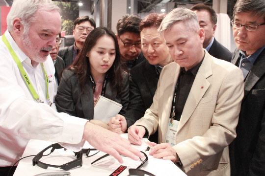 하현회 LG유플러스 부회장이 9일(현지시각) 미 라스베이거스에서 개최된 CES2019에서 노스홀에 위치한 뷰직스(VUZIX)를 방문, 스마트글래스가 미래 생활에 미치는 영향에 대해 살펴봤다. 뷰직스는 개인용 웨어러블 AR(증강현실)글래스를 선보이면서 구글과 연동시켜 TV방송정보, 음식점 메뉴 정보, 상품별 정보를 받을 수 있게 한다. 특히 하 부회장은 AR글래스라는 디바이스 자체에 대한 관심 외에 글래스와 연동되는 플랫폼을 비롯한 생태계 구축과정 등에 대한 관심을 보였다. LG유플러스 제공