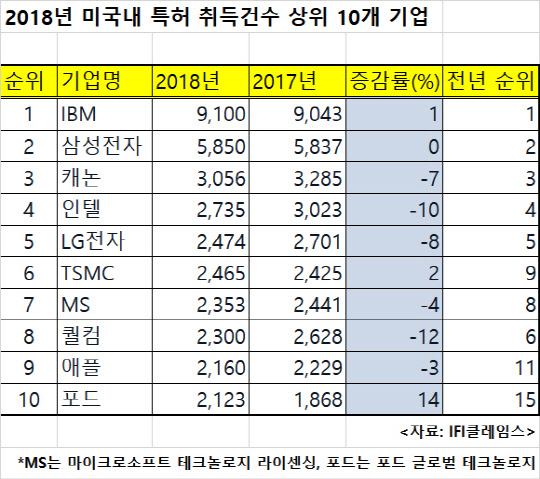 캐논(3056건)과 인텔(2736건), LG전자(2736건) 등도 '톱 5'에 이름을 올렸다. 이어 세계 최대 반도체 파운드리(수탁생산) 업체인 대만 TSMC와 마이크로소프트(MS) 계열사인 MS 테크놀로지 라이센싱, 퀄컴, 애플, 포드 글로벌 테크놀로지 등이 10위 내에 들었다.