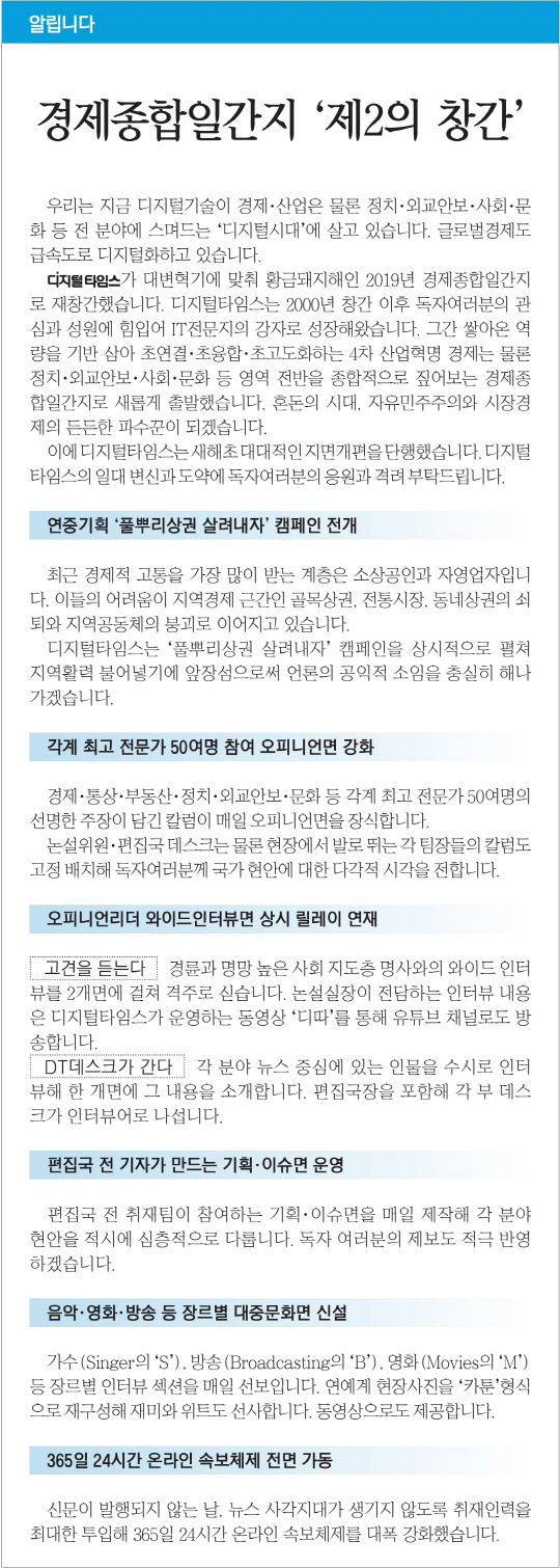 디지털타임스가 대변혁기에 맞춰 황금돼지해인 2019년 경제종합일간지로 재창간했습니다. 디지털타임스는 2000년 창간 이후 독자여러분의 관심과 성원에 힘입어 IT전문지의 강자로 성장해왔습니다. 그간 쌓아온 역량을 기반 삼아 초연결·초융합·초고도화하는 4차 산업혁명 경제는 물론 정치·외교안보·사회·문화 등 영역 전반을 종합적으로 짚어보는 경제종합일간지로 새롭게 출발했습니다. 혼돈의 시대, 자유민주주의와 시장경제의 든든한 파수꾼이 되겠습니다.