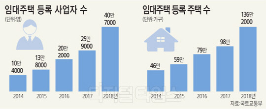국토부 통계를 보면 2017년 25만9000명이었던 임대사업자는 지난해 40만7000명으로 증가했다. 2016년(20만2000명) 대비 2배 가까이 늘었다. 등록주택 수도 2017년 98만 가구에서 지난해 136만2000가구로 1년 사이 38% 증가했다.