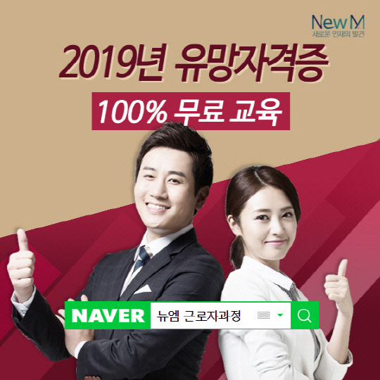 자격증 취득 전문 교육기관 뉴엠에서 관광통역안내사, 물류관리사 자격증 이외에 주택관리사, 소방설비(산업)기사, 전기기능사, 전기(산업)기사, 한국어교원 3급, 사회복지사 1급, 직업상담사 2급, 손해사정사, 경비지도사, 농산물품질관리사, 신재생에너지발전설비(태양광), 정보통신(산업)기사 등 다양한 자격증 교육 과정을 국비지원으로 100% 무료로 수강 가능하며 2019년 유망자격증 관련 더 자세한 안내와 수강 방법은 뉴엠 근로자과정 홈페이지에서 확인할 수 있다.