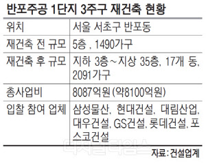 현재 10대 건설사 중 8곳이 입찰의향서를 제출하며 높은 관심을 보이고 있다. 삼성물산은 약 4년 만에 강남 재건축 시장에 등판해 래미안의 귀환을 알린 가운데 단지 인근 신반포 3차·반포 래미안 퍼스티지 등 수주 경험 내세우고 있다. 현대건설은 반포주공 1·2·4주구에 이어 3주구까지 수주해 7000여 가구의 반포 디에이치 브랜드타운을 조성한다는 밑그림을 내놨다. 대림산업은 반포아크로리버파크를 잇는 형제 단지로 만든다는 계획이다.