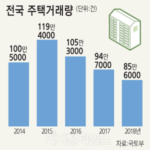17일 국토교통부에 따르면 작년 주택 매매 거래량은 85만6219건으로 2017년 94만7000건, 5년 평균(101만건)과 비교하면 각각 9.6%, 15.2% 감소했다.