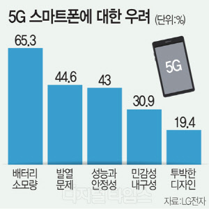 그러나 이와 함께, 1세대 5G 스마트폰에 대한 걱정도 큰 것으로 드러났다. 실제 조사대상의 65%는 5G 서비스 이용 시 배터리 소모가 늘어나는 것을, 45%는 발열을 우려했다. 내구성(30%)과 디자인(19%)에 대한 우려도 컸다.