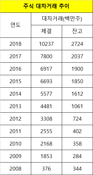 20일 금융투자협회에 따르면 작년 대차거래(체결기준) 규모는 전년보다 31.2%(2437만주) 증가한 102억3700만주로 사상 처음 100억주를 돌파했다. 증가율도 유럽 재정위기를 겪은 2013년(35.5%) 이후 5년 만에 가장 높았다.