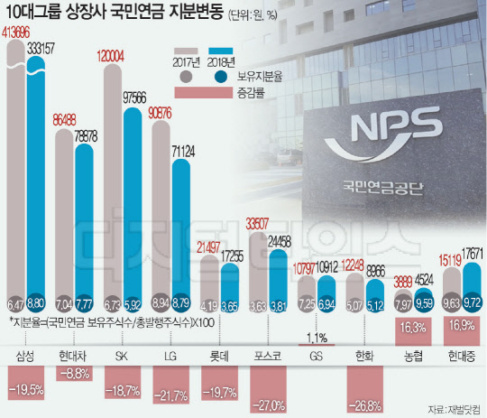 국민연금이 하락장에서 10대 그룹 상장사 지분을 늘렸지만, 보유 주식 가치는 2017년 말 80조8121억원에서 작년 말 66조4511억원으로 14조3610억원(-17.8%) 줄었다.