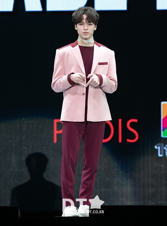 그룹 세븐틴의 버논이 21일 서울 송파구 올림픽공원 올림픽홀에서 열린 미니 6집 앨범 'YOU MADE MY DAWN(유 메이드 마이 던)' 발매 기념 쇼케이스에서 포즈를 취하고 있다.