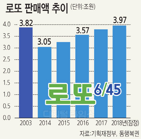 로또 판매액 종전 최고 기록은 한 게임에 2000원 시절이던 2003년의 3조8242억원이었다. 지난해 이보다 1416억원어치가 더 팔린 셈이다.