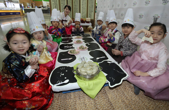 21일 오전 서울 서초구 농협하나로마트에서 한복을 입은 어린이들이 설 차례상에 올릴 만두를 빚고 있다.