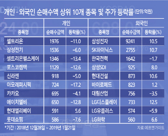 삼성전자 주가는 작년 1월 31일 5만4140원까지 치솟은 이후 작년 말 3만8700원까지 떨어지며 28.5% 하락한 채 마감했다. 하지만 올해 1월4일 3만6850원까지 떨어진 이후 이날 현재까지 주가는 10%이상 올랐다. 개인은 SK하이닉스(2975억원), 포스코(1005억원), LG화학(759억원), LG디스플레이(701억원) 등도 팔아치웠다.
