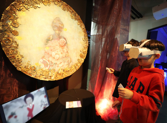 23일 오후 경기도 수원시 영통구 광교경기문화창조허브에서 열리고 있는 'ART & VR' 전시회를 찾은 학생들이 VR기술로 재구성된 신사임당의 작품을 체험하고 있다.