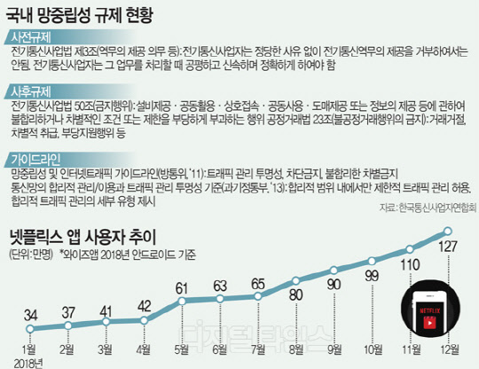 통신사들은 넷플릭스를 비롯한 해외 CP들의 트래픽 증가로 통신망을 증설하는 만큼, 망사용료 부과가 불가피 하다는 입장이다. 특히 올해부터 5G 상용화를 위해 천문학적인 규모의 인프라 투자가 진행되는 만큼, 망 고도화를 위해 새로운 개념의 망중립성 정책이 필요하다는 주장이다. 통신업계 관계자는 "과거 망중립성이 논의되던 시기의 네트워크는 데이터 전송만을 위한 단순한 전달망(Best-effort) 이었다"면서 "5G 네트워크는 산업별로 특화된 네트워크 제공으로 서비스별 속도를 달리할 수밖에 없으며, 이는 기존 망중립성과 상충된다"고 주장했다.