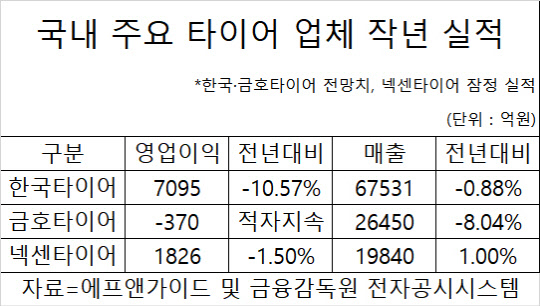 올해 역시 시장 전망은 어둡기만 하다. 현대차그룹글로벌경영연구소는 올해 세계 자동차 판매가 0.1% 증가한 9249대에 그칠 것으로 내다봤다. 타이어 업계 관계자는 "신차 시장 성장이 둔화하더라도 타이어 교체 시장에서의 수요가 중요하다"면서도 "지속하는 세계 경기 침체 여파로 교체 수요가 늘어날 지는 미지수"라고 말했다.김양혁기자 mj@dt.co.kr