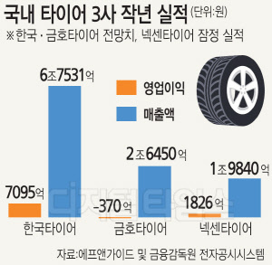 [디지털타임스 김양혁 기자] 국내 타이어 업계가 자동차 업황 부진 '후폭풍'을 맞았다. 한국·금호·넥센타이어 등 국내 3사의 작년 실적이 모두 뒷걸음질할 것으로 나타났다. 올해 자동차 시장 전망 역시 암울한 만큼 업계 경쟁은 더욱 심화할 것으로 전망된다.